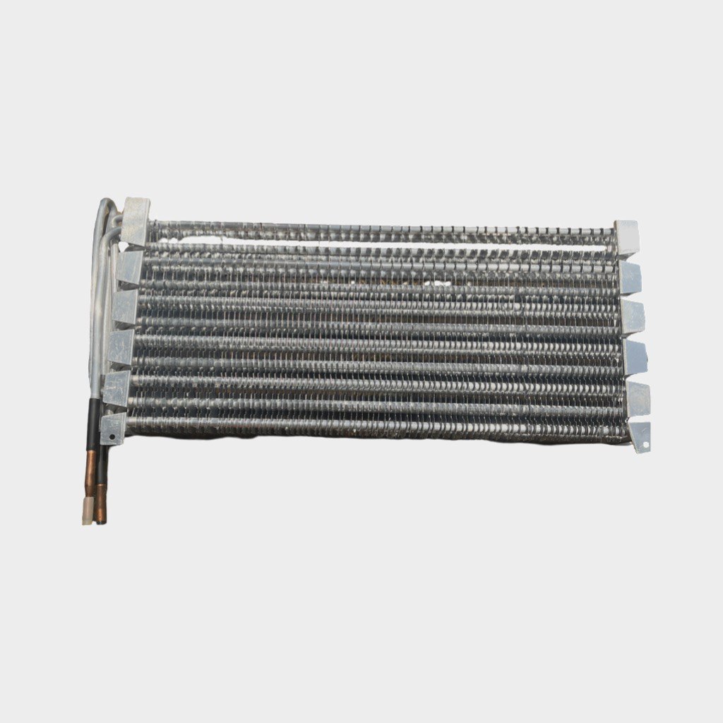 - عادةً ما يتكون المبخر من أنابيب نحاسية أو ألمنيوم، مع زعانف معدنية لزيادة سطح التبادل الحراري.
