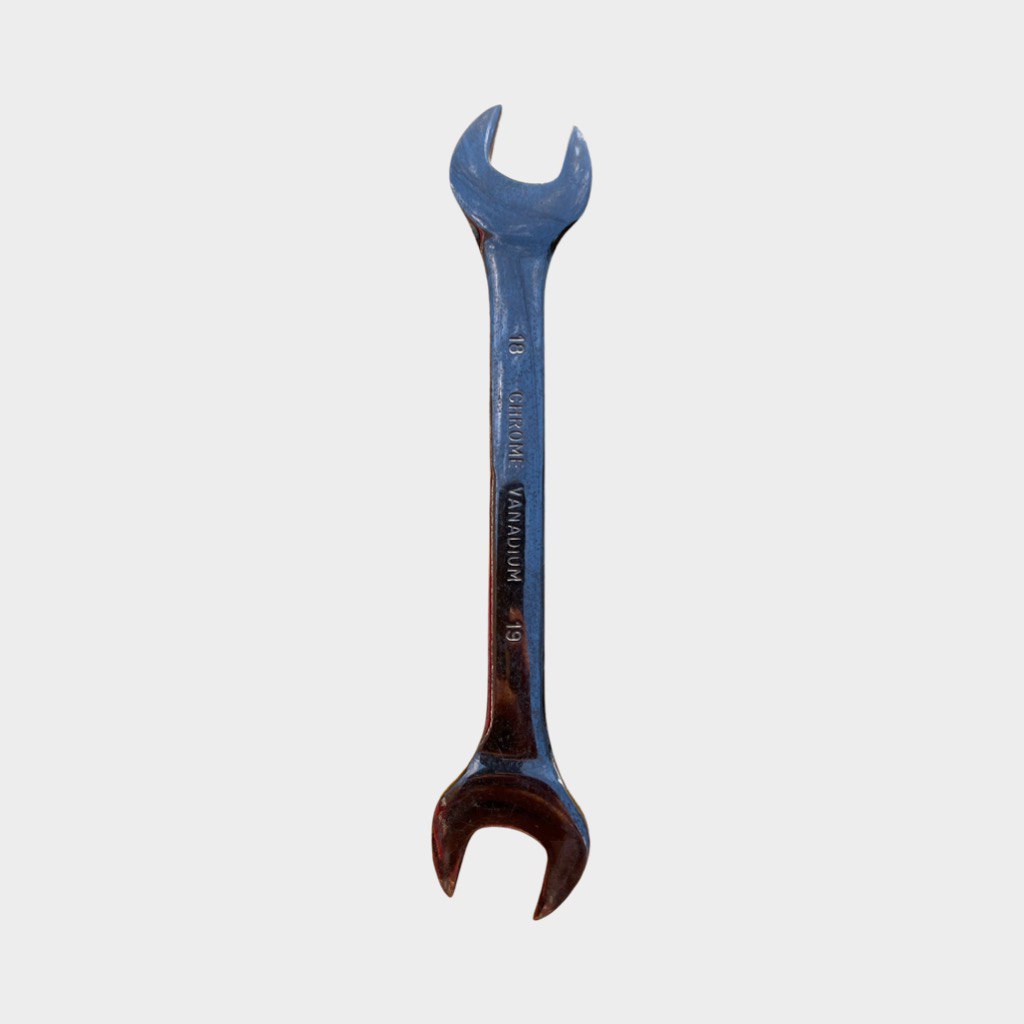 مفتاح مزدوج الاستخدام بمقاسين 18 مم و19 مم، مصنوع من الفولاذ المقوى، مصمم لفك وربط المسامير والصواميل بدقة وكفاءة في مختلف الأعمال الميكانيكية والصناعية.