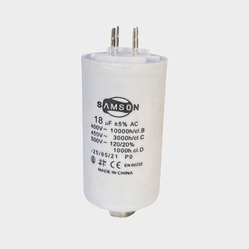 مكثف تشغيل بقدرة 18 µF من ، يُستخدم لتحسين كفاءة تشغيل المحركات الكهربائية وضمان بدء وتشغيل أكثر ثباتًا.