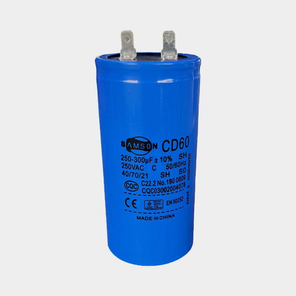 مكثف إقلاع عالي القدرة (Start Capacitor) من شركة ترمل، بسعة 250 – 300 µF، مصمم لتوفير عزم بدء تشغيل قوي للمحركات الكهربائية الثقيلة.