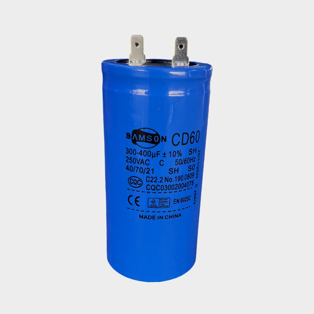 مكثف تشغيل/إقلاع عالي القدرة من شركة ترمل، بسعة 300–400 µF، مصمم لتشغيل المحركات الكهربائية الكبيرة التي تحتاج إلى عزم بدء تشغيل قوي.